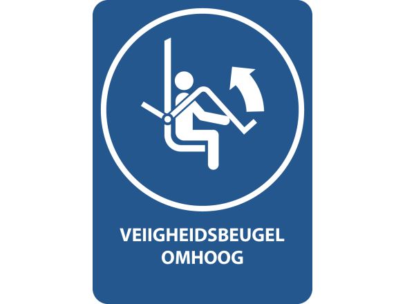 Veiligheidsbeugel op skistoeltjeslift omhoog doen, met tekst
